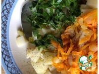 Добавить специи, каплю оливкового масла и мелко нашинкованную петрушку. Выложить к салату остывшие лук с морковью. Салат перемешать. |