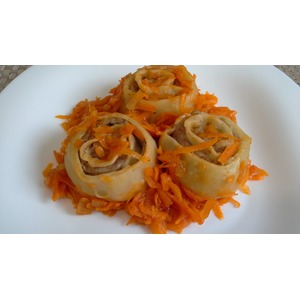 Тесто делим на две части. Раскатываем одну часть в прямоугольник (вторую кладем в пакет чтобы не заветрилась). Выкладываем половину начинки (оставляя свободными около 2 см с верхнего края), разравниваем и сворачиваем в рулет. Края защипываем.