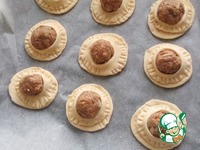 Заготовки будущей закуски складываем на противень, я застилаю пергаментом. Смазываем яйцом, вместе с фрикаделькой. |