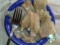 Зачищаем получившиеся куски от плёнок и оставшихся костей. Нам нужна только спинка. Снимаем мясо с кожи. Нарезаем на кусочки размером примерно 5х5 см. |