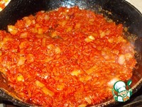 Добавляем томатную пасту. Перемешиваем и прожариваем еще 2-3 минуты. Готовую зажарку перекладываем в кастрюлю, в которой будем тушить перцы. |