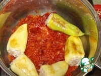 Обжаренные перцы выкладываем в кастрюлю поверх зажарки. Аналогичным способом делаем все перцы. |
