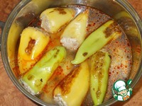 Укладываем перцы на бок, слоями друг на друга. Заливаем водой таким образом, чтоб верхний слой не был полностью покрыт. |