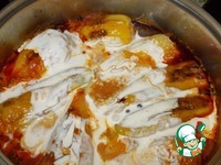 Ближе к концу тушения подготавливаем заливку. Смешать сметану с мукой и влить немного бульона из кастрюли с перцами. Перемешиваем венчиком, чтоб не было комочков. |