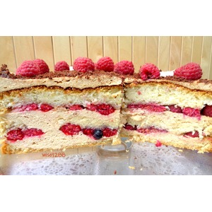 Описание: В этом летнем торте – десерте неповторимое сочетание ароматного ванильного бисквита, свежих ягод малины и воздушного творожного мусса, с ярко выраженным карамельным вкусом. Завершает вкусовую палитру шоколад.