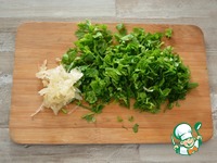 Переложите фарш в миску, добавьте нарезанную петрушку и измельчённый чеснок |