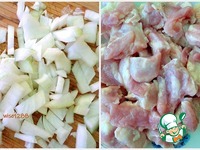 Порезать репчатый лук и курицу. |