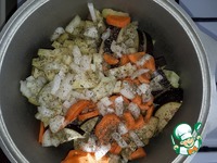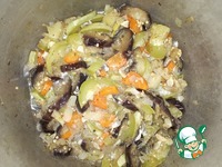 Добавить нарезанный лук белый к овощам, посолить, поперчить, добавить пряности и казанок закрыв крышкой поставить на медленный огонь. Во время приготовления необходимо помешивать. Тушить 30 мин. |