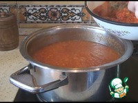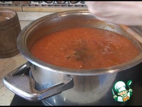 После этого выливаем измельченный томат, хорошо перемешаем, доводим до кипения и тушам на небольшом огне в течении часа, помешивая, он должен заметно увариться. |