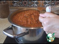 Примерно через полчаса после кипения томата добавим 1 ч. л. соли с горкой, 1 ст. л. сахара, перец по вкусу и 1 ч. л. орегано или любые другие травки, перемешаем и продолжаем тушить. |