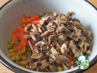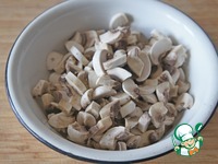Шампиньоны почистить и разрезать, в зависимости от размера грибов, либо половинками, либо четвертинками. Затем нарезать поперек на ломтики. Обжарить грибы до выпаривания сока и отставить в сторону. |