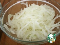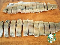 Просоленную рыбу хорошо промываем водой, высушиваем бумажными полотенцами и затем нарезаем на небольшие кусочки. |