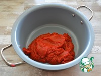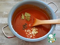 К томатной пасте добавьте воду и размешайте до однородности. Добавьте соль, сахар нарезанный чеснок, душистый перец и лавровый лист. |