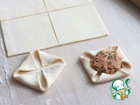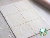 Слоеное тесто раскатать. Вырезать квадраты. Всего у вас получить из двух квадратов 12 шт слоек. |