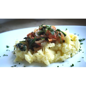 В качестве гарнира у нас свежайшее и нежнейшее картофельное пюре. Выкладываем поверх овощи и шпинат. Посыпем зеленью петрушки и укропа.