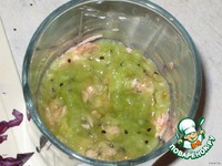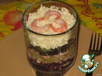 | Креветки отварить в подсоленной воде, остудить и очистить. Капусту тонко нашинковать, присолить и помять руками для мягкости. Морскую капусту откинуть на сито, дать стечь жидкости и немного порубить ножом, чтобы потом удобнее кушать. Тунец порезать кубиками. Адыгейский сыр натереть на мелкой терке. Для заправки. Волосатика обрить ))))) (очистить киви) и натереть на мелкой терке, добавить мед, горчицу, сок лимона и оливковое масло, поперчить, посолить по вкусу, хорошо перемешать. В салатник или порционные креманки выкладывать слоями: |