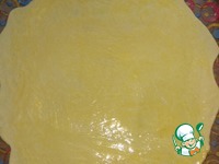 Каждую часть теста раскатать в тонкий пласт толщиной примерно 2 мм (раскатывать подпыляя стол и тесто мукой). Смазать растопленным сливочным маслом. |