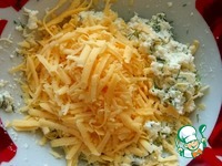 Творог смешать с измельчённым чесноком, мелко нарезанным укропом и щепоткой соли. Добавить натертый на крупной терке сыр. Перемешать. |