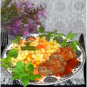 Верх котлет немного зарумянился. Подавала их с отварными макаронами и овощами - горох, морковь и брокколи. |