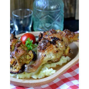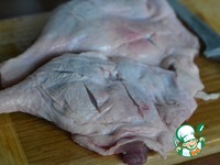 Утиные бедра обсушить кухонными салфетками. Удалить верхнюю кость и ножом сделать "кармашек" в мясе. |