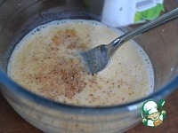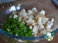Рогалик или булочку нарезать на маленькие кусочки. Петрушку мелко нарезать. Добавить к молочной смеси и аккуратно перемешать. |