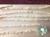 Проверяем тесто, оно должно подняться. Раскатываем его и режем на тоненькие полосочки |