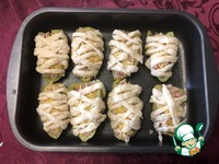 Собираем блюдо. В перец складываем начинку из фарша, сверху посыпаем сыром и заворачиваем в тесто имитируя бинты. Готовые перцы ставим в духовку, разогретую до 180 гр. на 30 мин. |