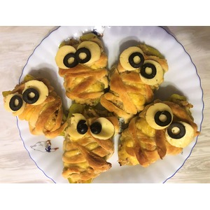 Готовим глаза. Из сыра формочкой выдавливаем круги, оливки режем на дольки. Украшаем готовое блюдо. Приятного аппетита! |