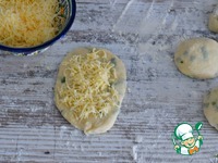 Каждую часть теста раскатать в овальную лепешку. Поверхность лепешки посыпать тертым сыром. (примерно 1 ч. л) |