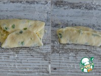 Подвернуть края овала к середине, слегка придавить. Затем сложить пополам и слепить обе стороны между собой. Получается продолговатый пирожок-булочка. |
