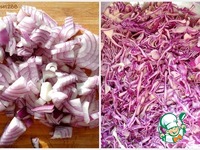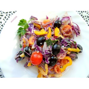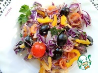Описание: Овощной салат на основе краснокочанной капусты с контрастными по цвету сочными овощами и маслинами – краски осени в одной тарелке.