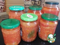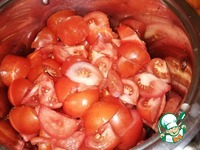 Затем в кастрюлю с толстым дном выкладываем помидоры, специи, подсолнечное масло, уксус, соль и сахар. Ставим на средний огонь и варим после закипания еще 40 минут.