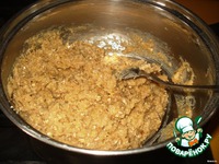 Сначала маргарин взбить с сахаром, добавить туда 1 яйцо, потом орехи и хлопья и в конце просеянную муку и разрыхлитель. Хорошенько перемешать. Тесто не должно быть слишком крутым. |