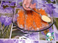Тем временем нарезаем лук полукольцами. Морковь натираем на терке для моркови по-корейски. Готовим заливку: смешиваем яйцо с кефиром и солью по вкусу. |