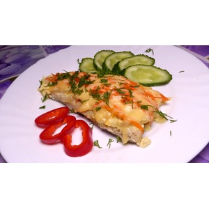 На филе выкладываем лук, затем морковь, солим овощи. Заливаем заливкой, накрываем фольгой и отправляем в разогретую до 180 градусов духовку на 35-40 минут. |