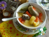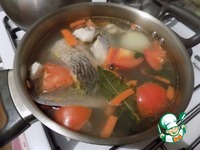Далее-очередь рыбы. В ухе я использую всё: и голову и хвост. Рыбу чищу, потрошу, вынимаю жабры, срезаю плавники. Хвост оставляю с плавником. Режу на куски. Голову отрезаю с захватом "мяса". Вот у этого карпа два самых толстых куска из серединки я оставила запечь. Отрезала ещё два ближе к хвосту на уху. В готовый овощной отвар выкладываю рыбу и сразу же с ней кладу помидор, порезанный тоже крупно. Рыбу варим до готовности. Рыба быстро варится, примерно минут 10. Нужно чтобы куски рыбы остались целыми и не развалились. Вот сейчас я налью 1 ст л оливкового масла в уху и сниму её с огня. Вас я делать этого не заставляю, это на любителя. Мне очень нравится бульон с ним на вид, да и на вкус. Иногда подсолнечное добавляю. Масло добавляю особенно, если уха варится из речной и не жирной рыбы. |