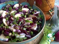 Описание: Красивейший салат, оставляющий прекрасное послевкусие. В меру пикантный, чуть деликатесный, ароматный..., добавит праздника на Вашей кухне. Повторила от В. Емельяненко, добавила любимый красный лук и заменила миндаль на свои семечки.