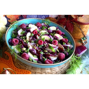 Но заключительным штрихом украсим салат малиной. |