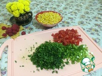 Измельчите помидор (если небольшие, то лучше взять два), зелень (петрушку, укроп - полпучка), зелёный лук (его тоже можно заменить на репчатый). |
