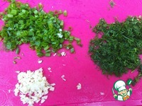 Приготовим начинку. Растопить сливочное масло, добавить к нему растительное масло и щепотку соли, перемешать. Зелёный лук, укроп и чеснок мелко нарезать. |