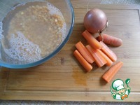 Горох заливаем водой. Кладём в кастрюлю с мясом луковицу целую в шелухе и морковь, порезанную крупно. Варим бульон примерно 30 минут. Не солим. |