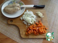 Вторую луковицу, чеснок и отваренную морковь режем мелко произвольно. |