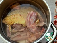 Хребет и шею курицы вымыть, залить холодной водой, варить 45 - 60 минут, чуть подсолив. |
