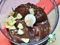 Нарезать на куски и измельчить в блендере ( мясорубка) с чесноком. |
