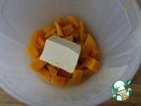 Добавляем к тыкве масло комнатной температуры и всё пробиваем в пюре блендером. |