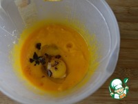 Добавляем яйцо, сахар, соль, мёд и специи. У меня смесь специй для глинтвейна. Всё перемешиваем блендером. Если тыква сладкая, то сахара кладите меньше. Я вообще не клала сахар. |