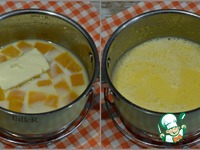 Снять тыкву с огня, воду не сливать. Добавить в кастрюлю с тыквой 100 мл холодного молока (+- 10 мл) и сливочное масло. Пюрировать массу. Должно получиться 300 мл молочно-тыквенной смеси. |