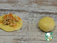 Из каждой заготовки раскатать лепешку диаметром 10-11 см. В середину лепешки положить столовую с горкой ложку начинки, тщательно слепить края лепешки, сформировав круглый пирожок. |