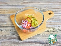 В чашку порезать мелкими кубиками - помидор, огурцы, лук. |