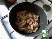 На сковороду наливаем масло, греем его и выкладываем печень. Обжариваем её совсем немного, до красивого цвета. Перекладываем печень в посуду, где её потом будем тушить. |